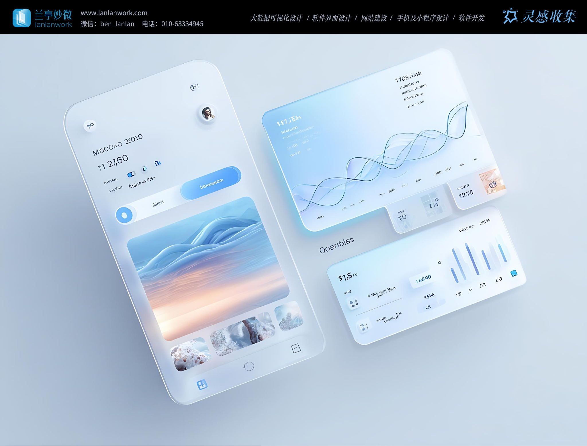 質感上大量運用玻璃態(毛玻璃、透明漸變)和柔滑曲面,界面元素如懸浮卡片、按鈕邊緣呈現細膩的光影過渡,搭配圓潤的圓角設計,讓整體風格顯得輕盈且富有呼吸感,例如第二張圖中半透明的界面模塊,第四張圖里柔和的卡片邊緣,增強了設計的精致度與柔和感。