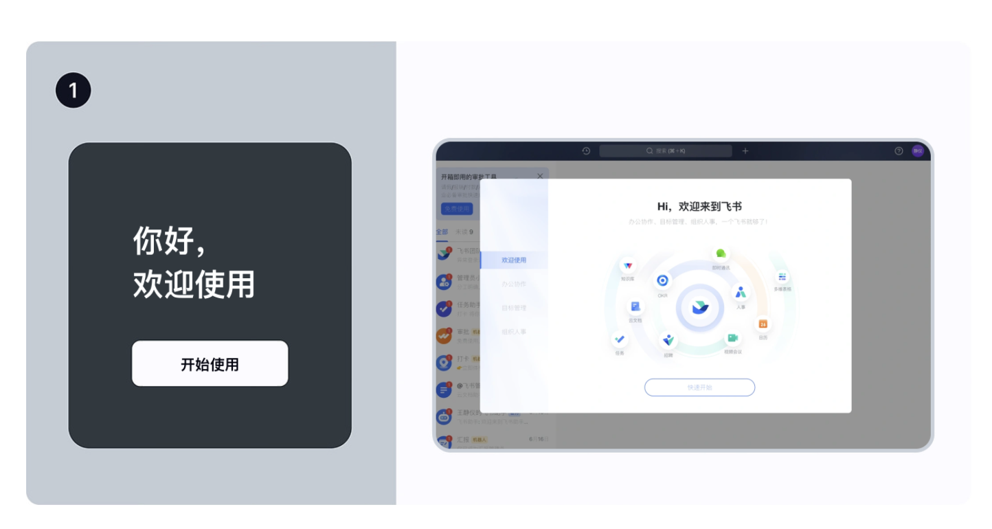 - 例子:飛書的歡迎頁會直接告訴用戶 “這里有辦公協作、云文檔、審批等功能”,既點明核心價值,又定下專業的辦公氛圍;