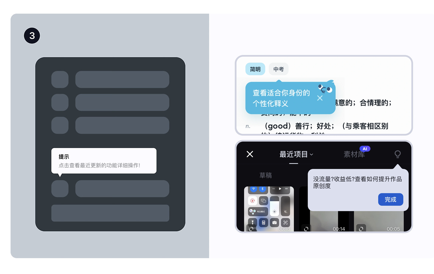 - 例子:稅務 APP 新增 “待辦功能” 后,會在 “待辦” 入口旁彈氣泡,告訴用戶 “這里能處理未辦結事項”,用戶點 “知道了” 就關閉,不影響正常使用;