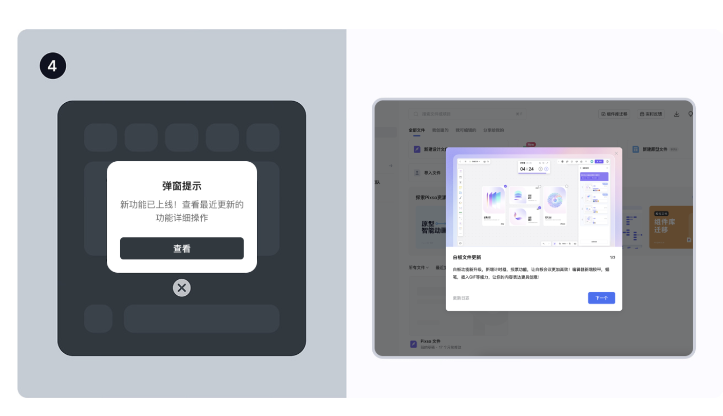 - 例子:Pixso 更新白板功能后,用彈窗提示 “新增計時器、投票功能”,用戶看完能直接點 “查看” 或 “關閉”;