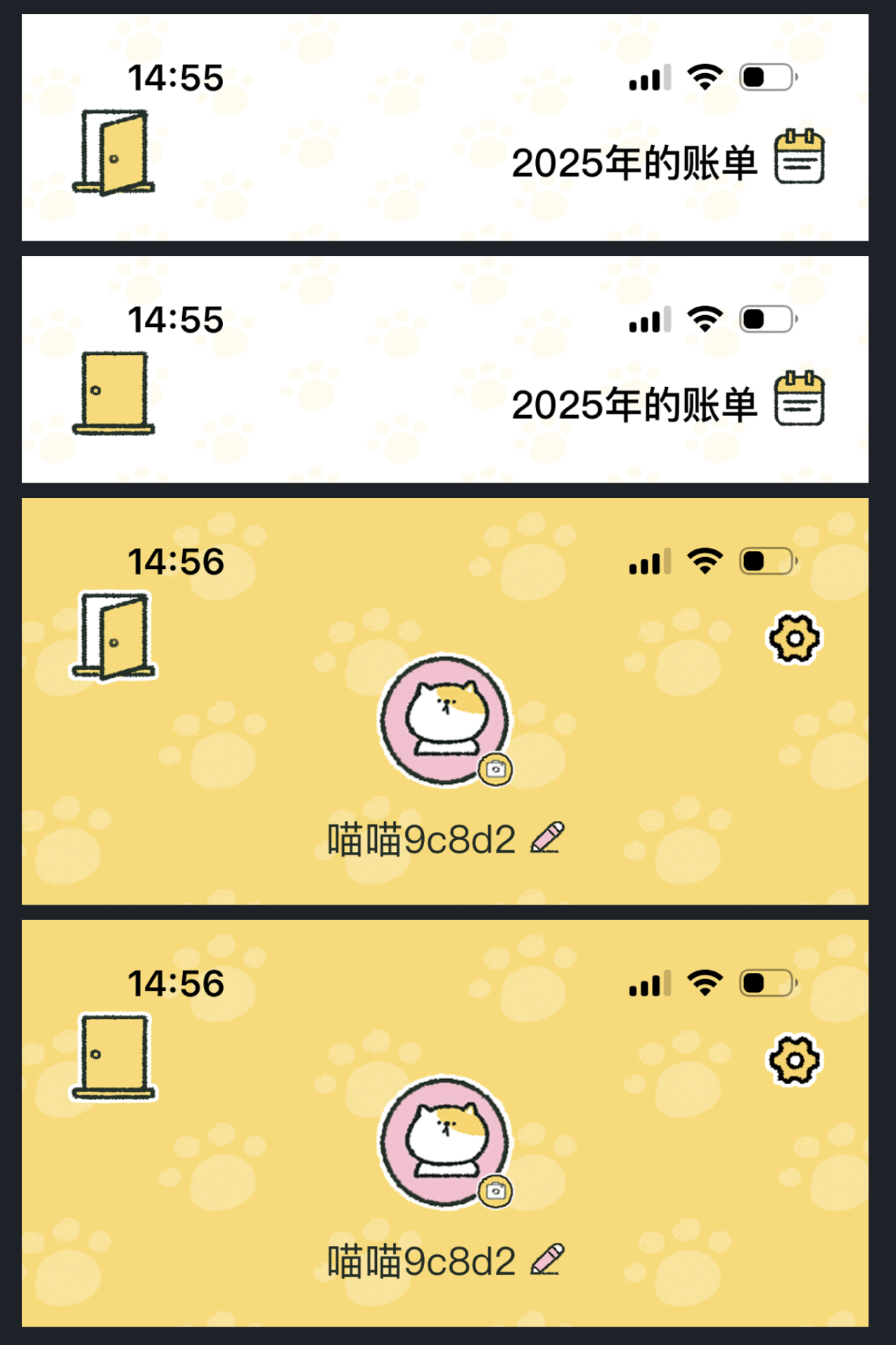 喵喵記賬 APP的做法,是把 “層級切換” 轉化為用戶熟悉的生活場景 —— 用 “門” 作為核心元素。