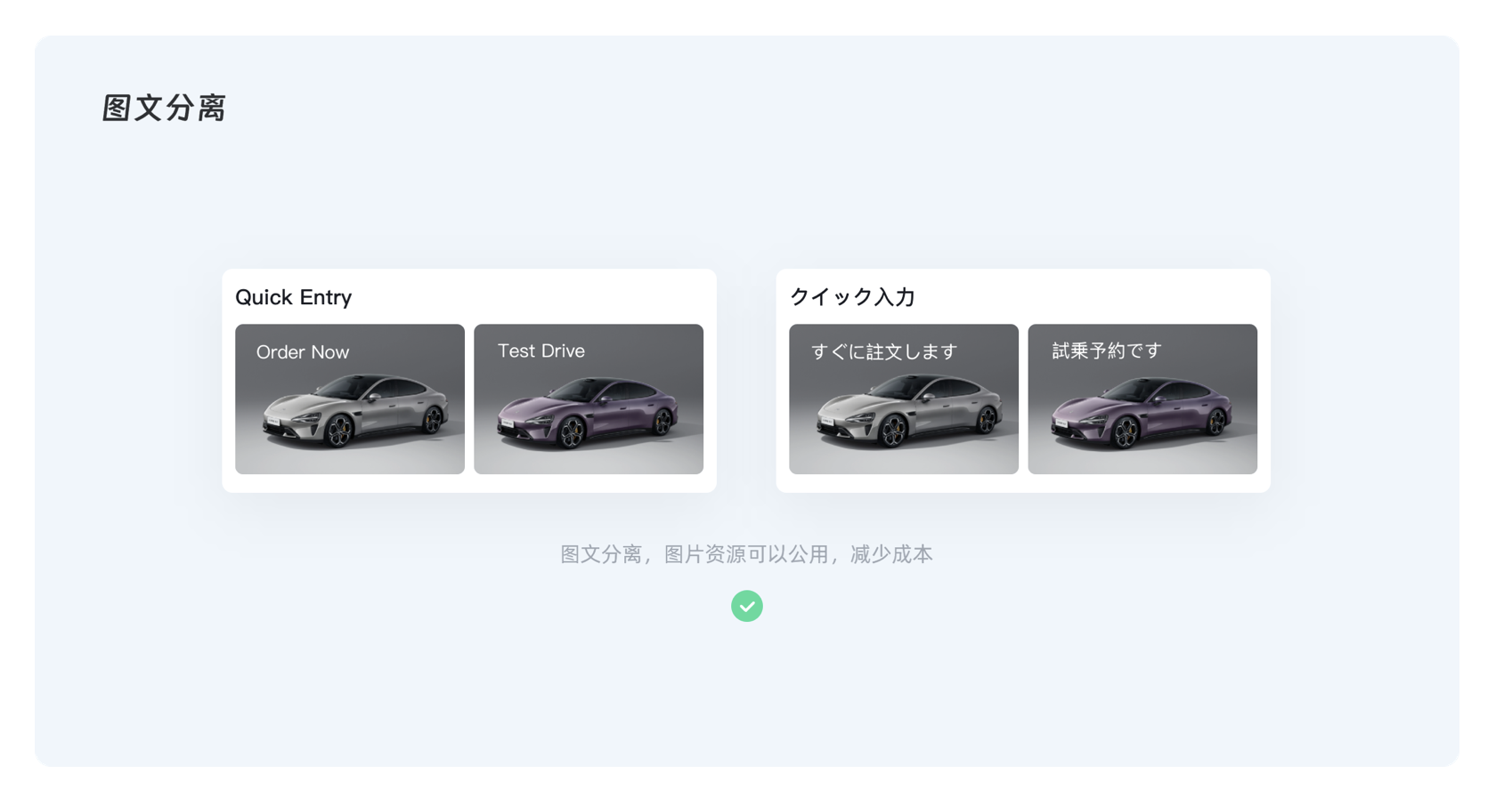 - 文本單獨用代碼實現:圖片作為背景,文本用代碼調用不同語言的字符串(如中文 “立即下單”、英文 “Order Now”),一張圖片適配所有語言。