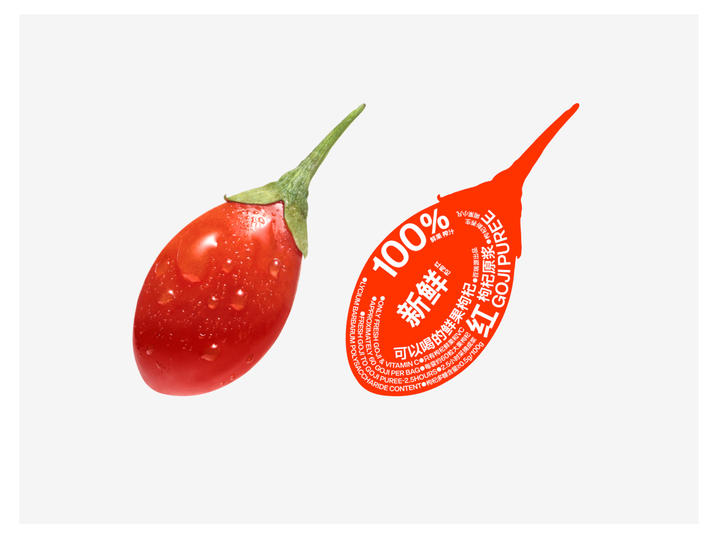 包裝的視覺中心是一顆巨大、飽滿的枸杞圖形,沒有多余裝飾,直接將消費者的注意力鎖定在原材料上。圖形還原了枸杞新鮮、圓潤、多汁的形態,甚至通過微妙的明暗對比呈現果實的質感,無需過多文字,便直觀傳遞出 “原料優質” 的核心信息。這種 “單一核心圖形” 的設計,避免了多元素競爭視覺焦點,讓產品記憶點更鮮明。