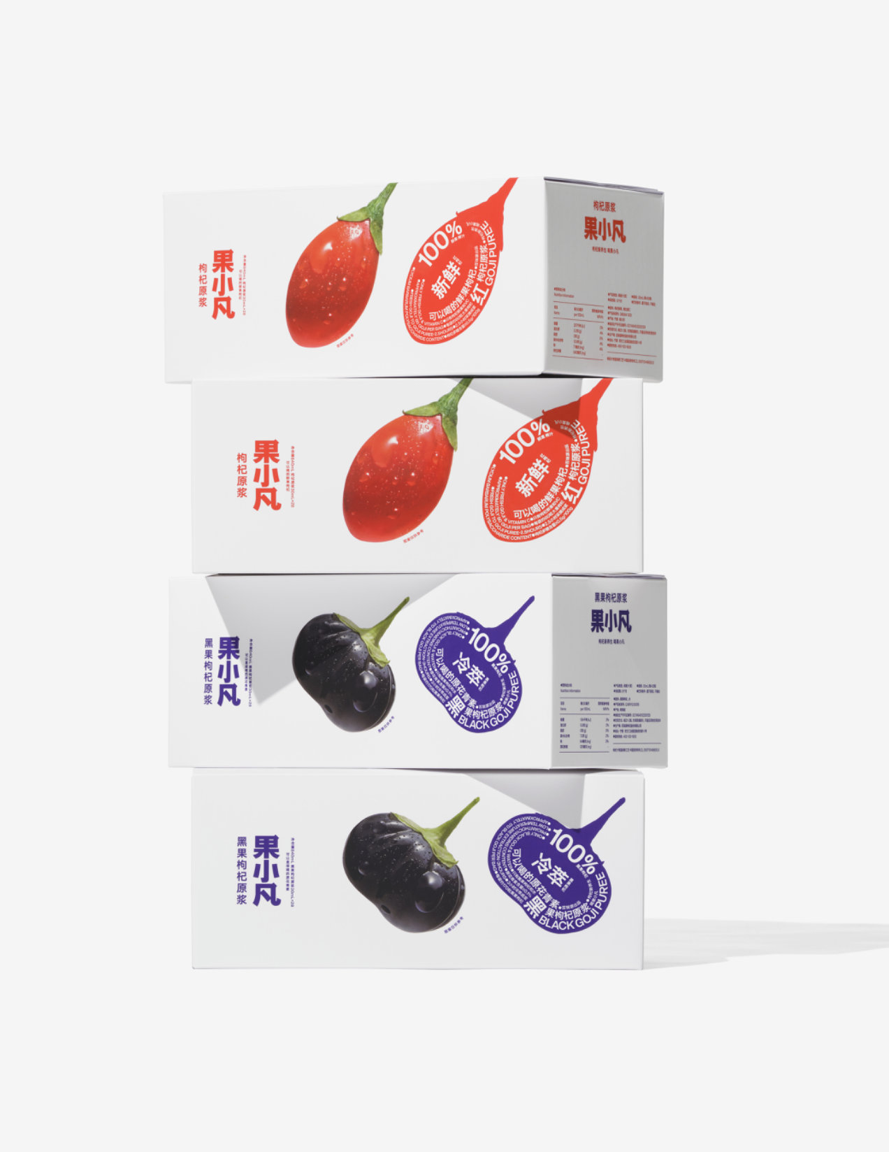在信息過載的消費場景中,復雜的包裝設計往往會分散消費者注意力,而 “Less is more”(少即是多)的設計理念,正成為食品包裝的主流趨勢。百瑞源旗下 “果小凡” 枸杞原漿的包裝設計,便是這一理念的絕佳詮釋 —— 它摒棄冗余元素,以純粹的設計語言聚焦產品核心,讓消費者一眼讀懂價值。本文將結合這款案例,拆解簡約包裝的設計邏輯與可復用技巧。