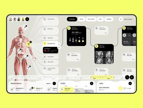 • 設計邏輯:面向患者或健康管理用戶,通過具象化的人體模型、直觀的健康數據圖表、流程化的交互設計(如病情關聯、健身計劃生成),降低專業信息的理解門檻,打造友好、易用的健康管理或健身指導體驗,兼顧信息整合與用戶交互的流暢性。