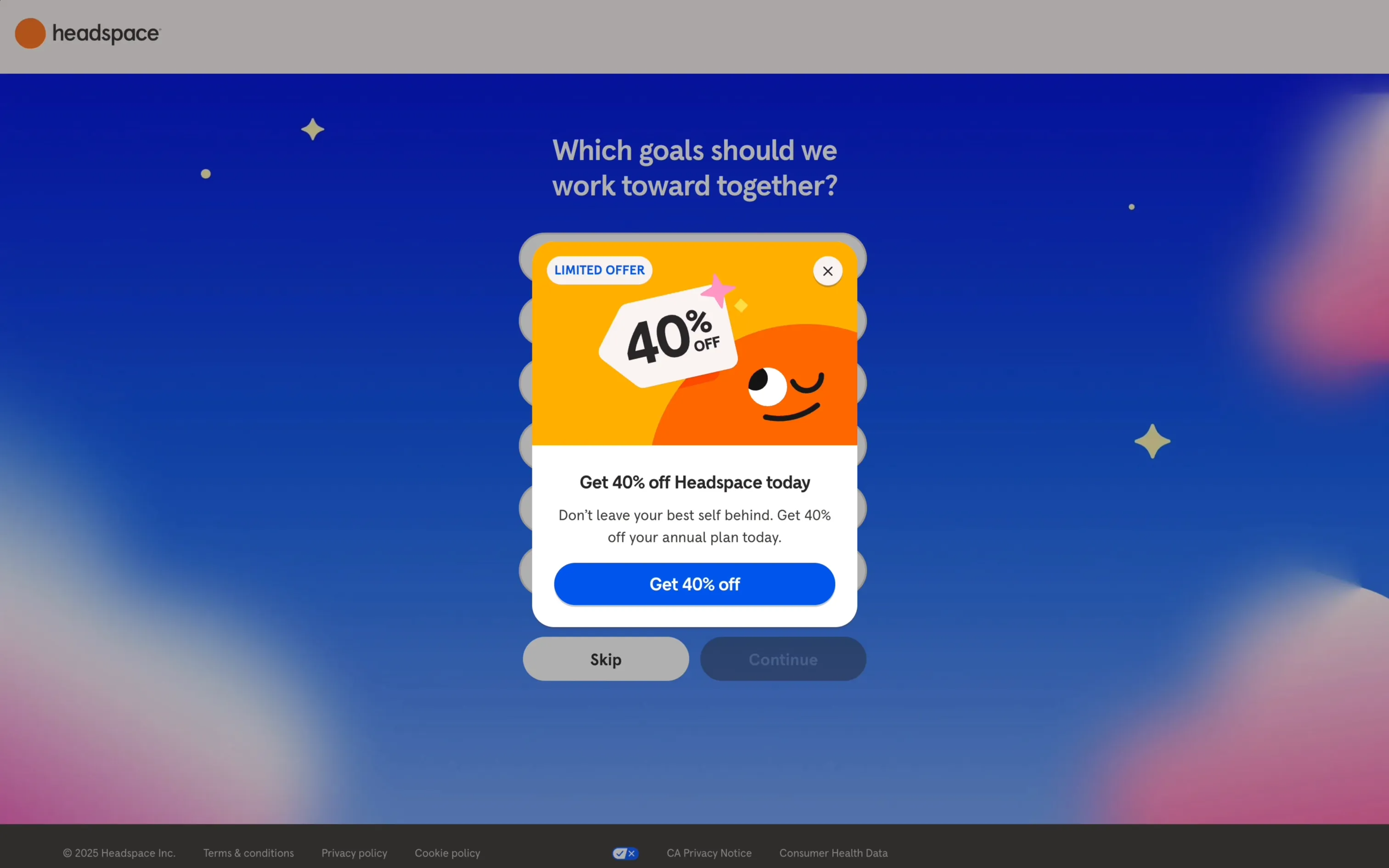 界面在交互設計中注重給用戶 “被回應” 的情感滿足,同時尊重用戶決策。例如勾選框的動效、按鈕的微交互(如 Gemini 界面的卡片 hover 反饋),讓每一步操作都有即時反饋,減少用戶的操作焦慮;而 Headspace 優惠彈窗提供 “Get 40% off” 和 “Skip” 兩個選項,避免強制營銷帶來的反感,體現了對用戶自主決策的尊重,提升了用戶的情感舒適度。