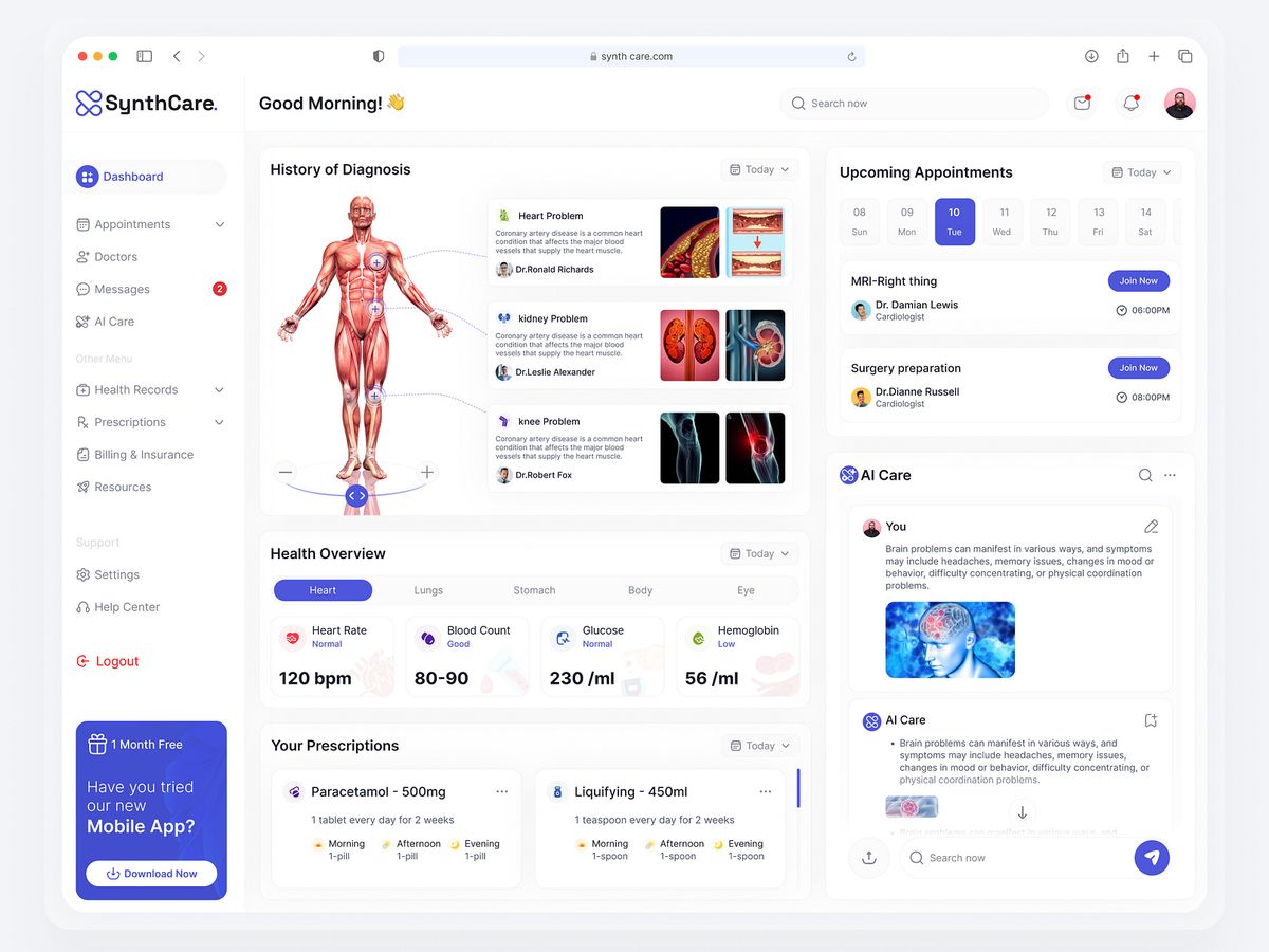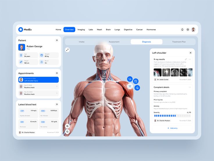 • 視覺設計:以淺色或清新色調為主(部分融入科技感配色),采用卡片式、模塊化布局,結合 3D 人體模型、簡約數據可視化和親和力強的交互元素(如按鈕、進度條)。