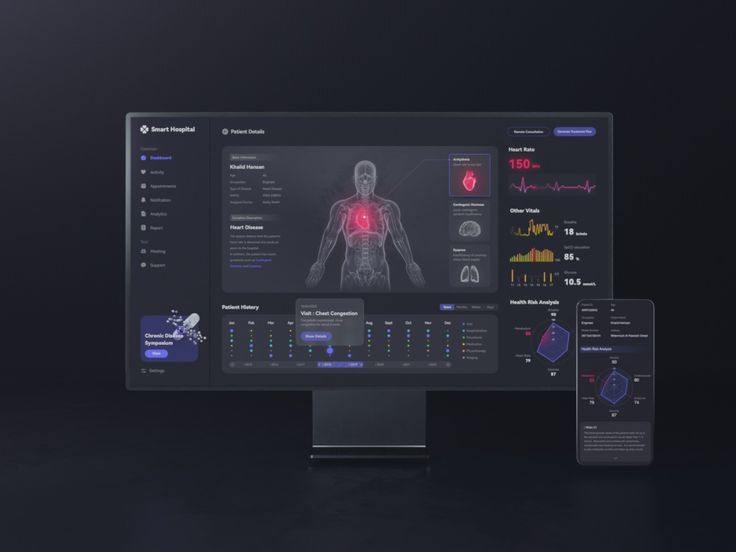 • 視覺設計:以深色背景為主,搭配高對比度的醫療影像或數據可視化元素(如 CT/MRI 影像、生命體征圖表),界面元素簡潔且功能性強,多采用扁平化圖標和專業工具型布局。