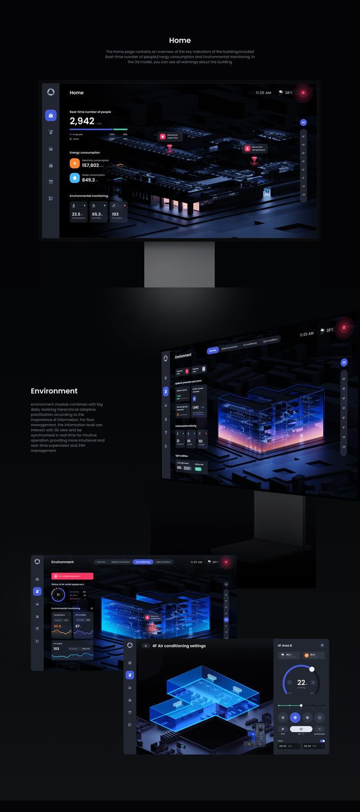 安防場景對 “信息傳達的高效性” 要求極高。這類設計以深色為基底,如同為數據與畫面打造了一塊 “聚焦幕布”,3D 模擬場景直觀呈現空間與設備狀態,讓復雜的安防系統變得可感可知。各類數據卡片用簡潔的版式與醒目的色彩,把異常警報、設備運行時長等關鍵信息快速推送給用戶。于我們而言,好的安防 UI 設計,就是要在科技感的營造下,依然保持 “讓用戶秒懂信息” 的易用性,這也是我們在相關項目中會借鑒的核心思路 —— 用視覺的 “科技感” 吸引關注,用交互的 “直白感” 提升效率。